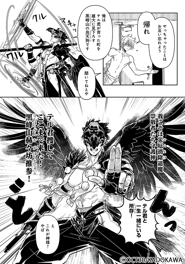 かか丸は鬼退治がきっかけで人間に祀ってもらい神様になった鴉天狗です。
