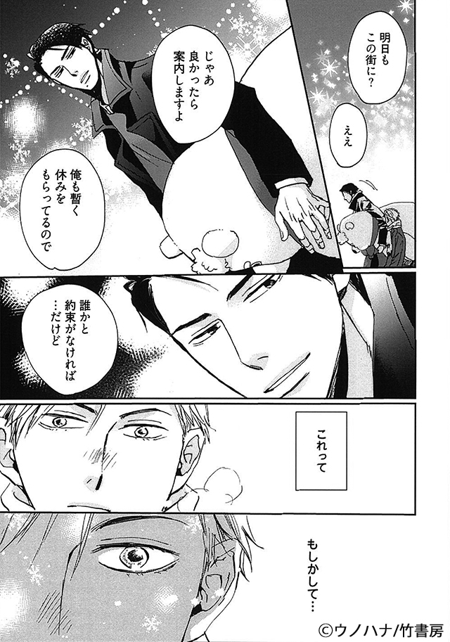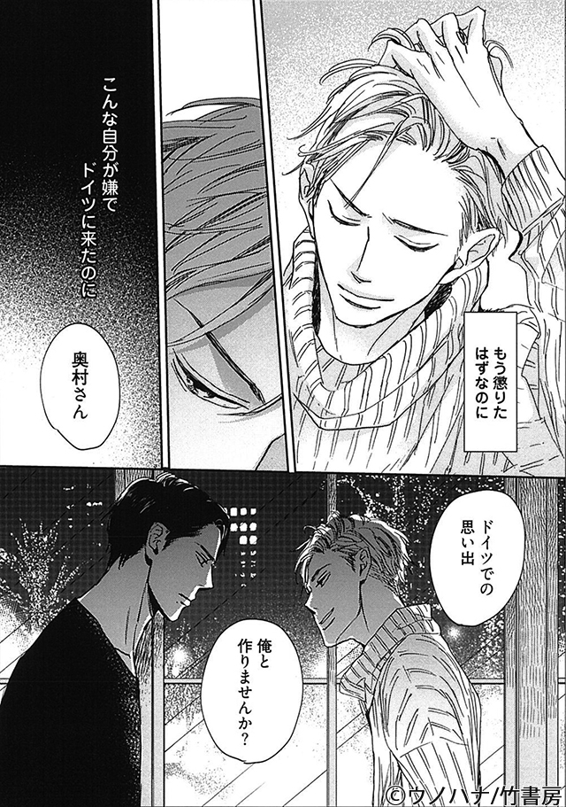 製薬会社のトップ営業・東湖は、ドイツに海外赴任して2年。東京の本社へ戻る前の思い出作りにクリスマスマーケットを訪れる。幻想的な街角で出会ったのは、巨大なぬいぐるみを抱えたひときわ目を引く日本人・奥村。ドストライクな顔面に見惚れ声をかけると次の日にまた会う約束になり、昂る気持ちでデートへ。真正面から口説かれ、一晩で身体も理性も融かされてしまう。本能的に惹かれ合ったふたりは帰国するまでの“期間限定カレシ”として一緒に過ごすことに――。